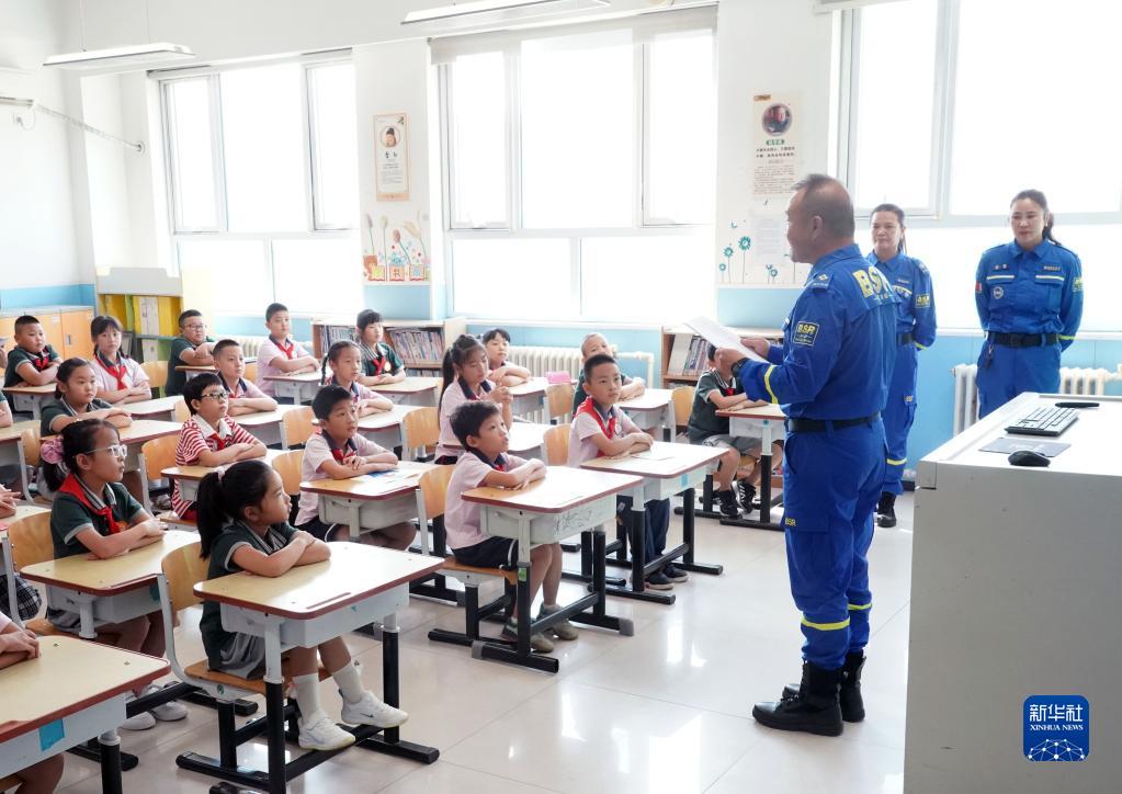 9月1日,在北京市門頭溝區京師實驗小學,門頭溝區藍天救援隊的隊員們在開學第一課中與學生交流。