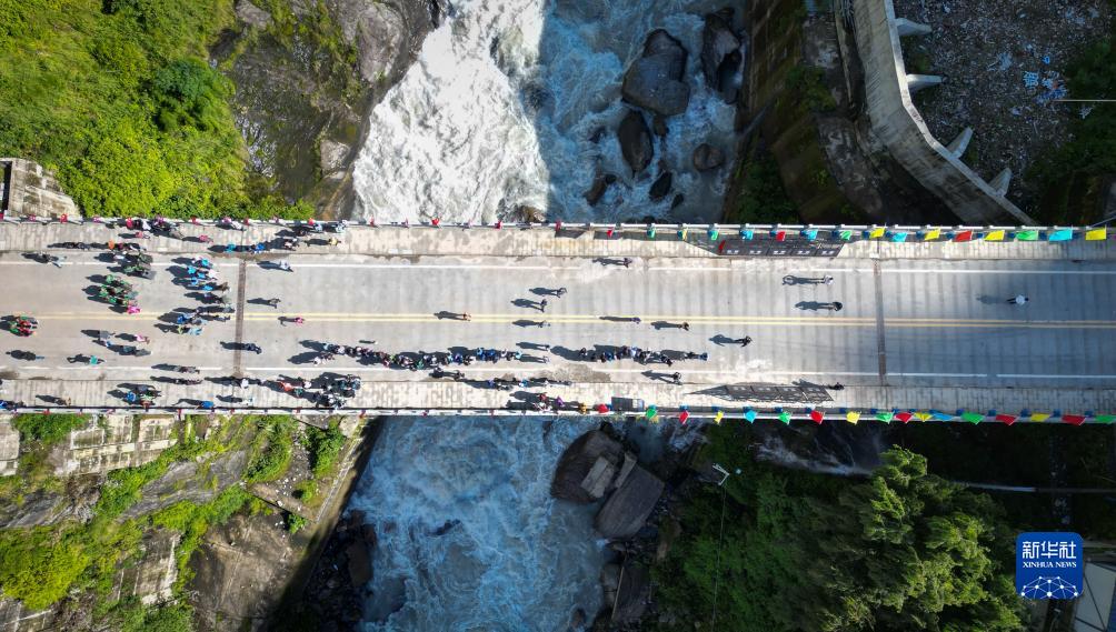 9月1日,往來中尼兩國的人員跨過友誼橋(無人機照片)。