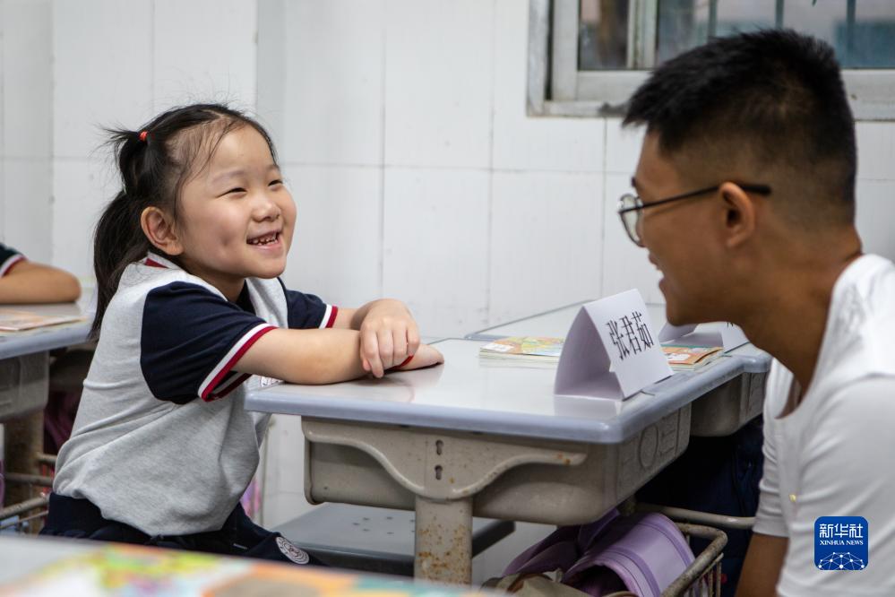 9月1日,在重慶育才實驗學校華巖校區,豆豆在教室內和老師交流。