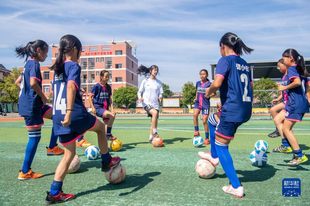 9月1日,在重慶市石柱縣三河鎮的三河小學,秦芙蓉(中)和足球隊隊員們在操場上練球。
