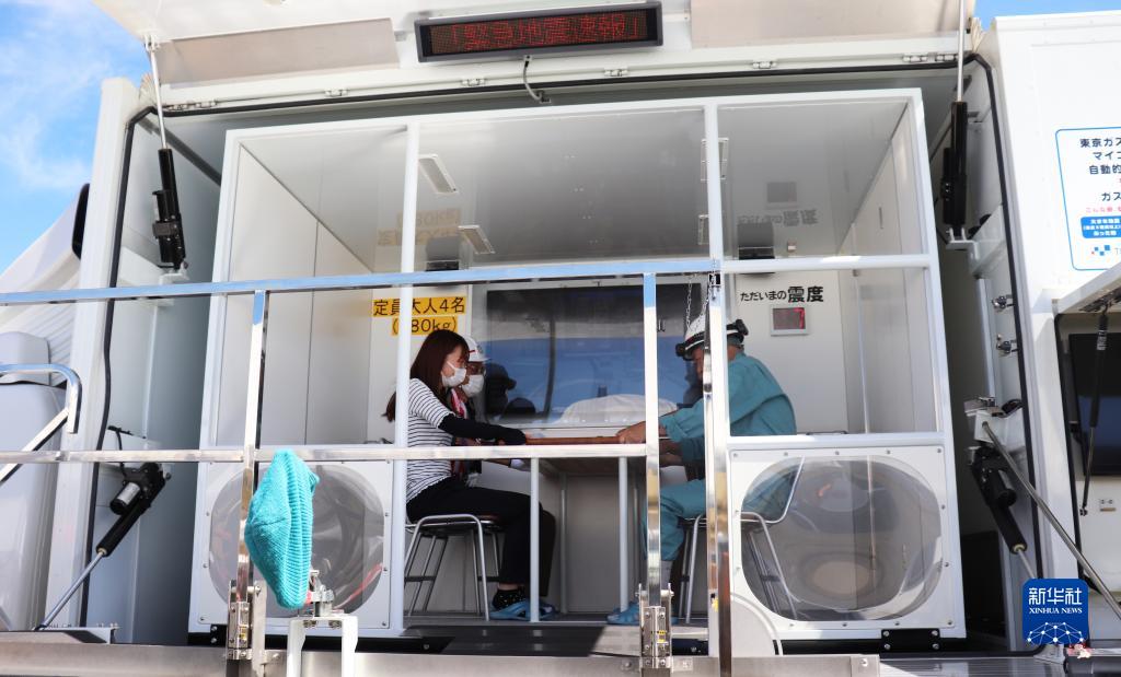 9月1日,在日本神奈川縣相模原市,民眾在地震體驗車內感受模擬地震。