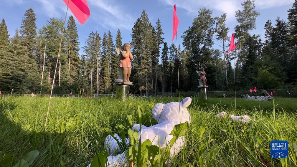 這是8月31日在加拿大薩斯喀徹溫省博瓦爾印第安人寄宿學校舊址拍攝的用粉色旗子標出的疑似兒童和嬰兒墓地。