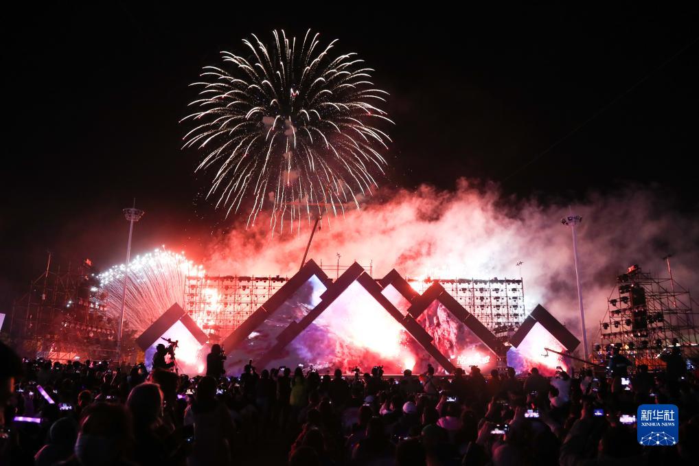 這是9月1日拍攝的晚會(huì)現(xiàn)場(chǎng)焰火表演。