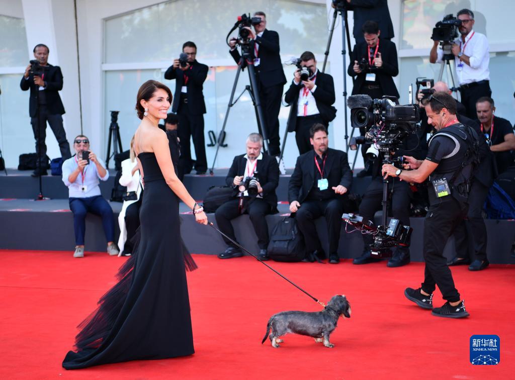 9月1日,在意大利威尼斯,演員卡泰麗娜·穆里諾牽著寵物狗亮相電影《可憐的東西》首映式紅毯。