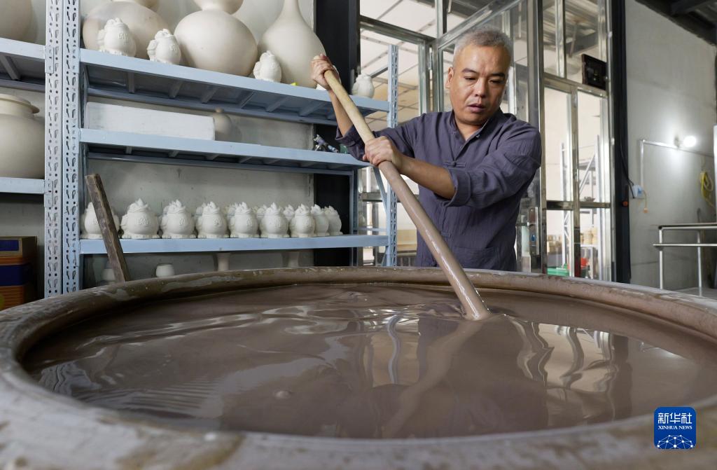 8月31日,在清涼寺村的一家汝瓷生產企業,汝瓷藝人王占穩在車間里準備施釉。