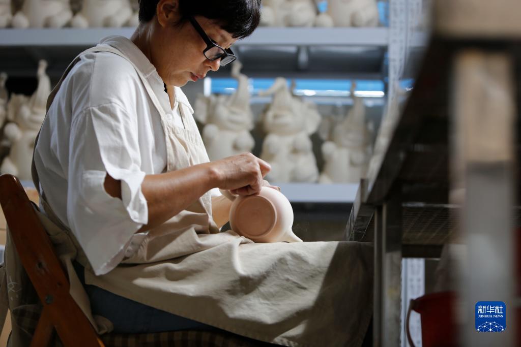 8月31日,在清涼寺村的一家汝瓷生產企業(yè),工作人員在車間里加工汝瓷產品。