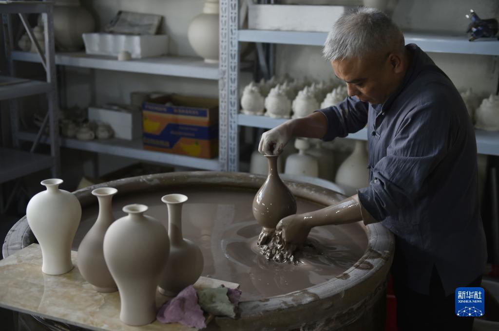 8月31日,在清涼寺村的一家汝瓷生產(chǎn)企業(yè),汝瓷藝人王占穩(wěn)在車間里施釉。