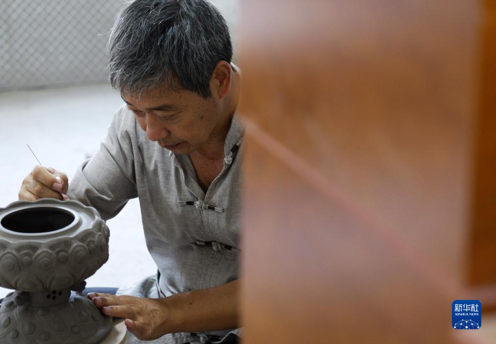 8月31日,在清涼寺村的一家汝瓷生產企業,汝瓷藝人王國奇在車間里修坯。