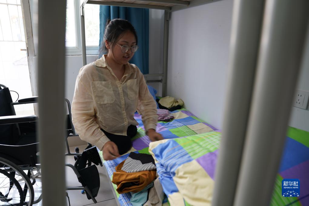 蔣張子怡在學(xué)校寢室里收拾衣物(9月1日攝)。