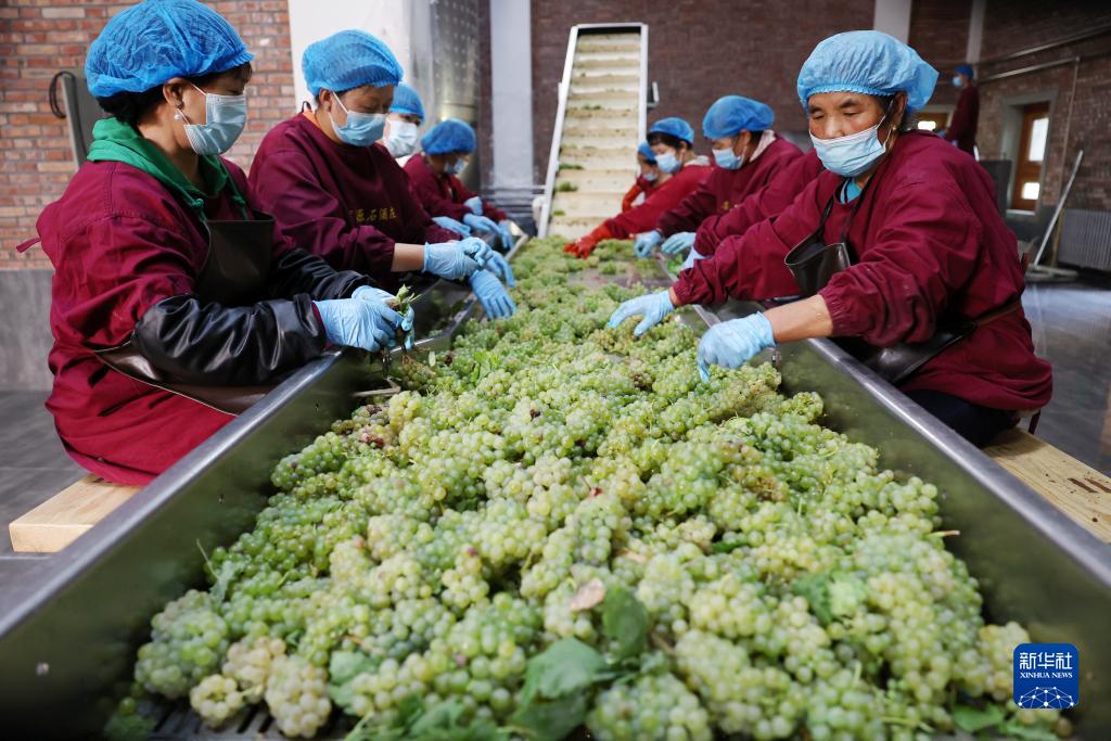 工作人員在銀川市西夏區志輝源石酒莊分揀釀酒葡萄(9月1日攝)。