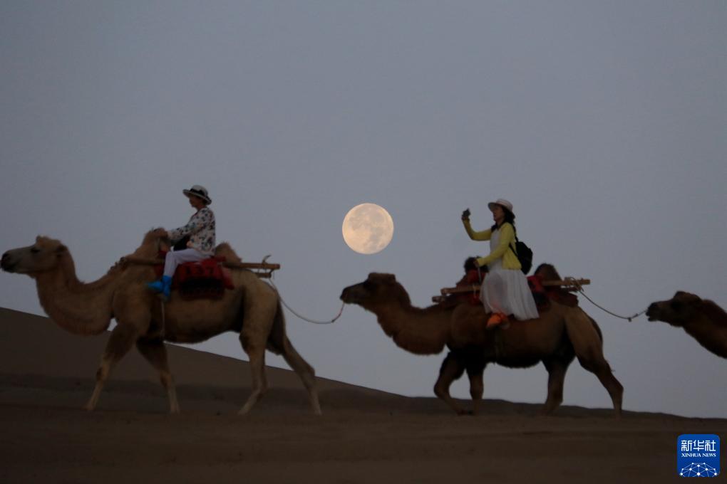 9月1日清晨,一輪圓月懸掛在甘肅省敦煌市鳴沙山月牙泉景區上空,游客騎乘駱駝,領略大漠風光。