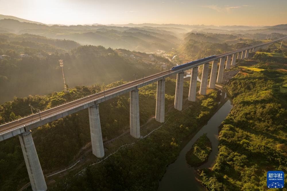 8月31日,一列動車組在晨曦中經過位于貴州省獨山縣郊外的貴南高鐵銀坡河特大橋(無人機照片)。