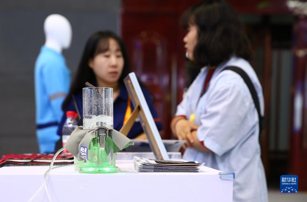9月2日,在國家體育館舉行的服貿會環境服務專題展上,觀眾在中科海勢展臺展出的拓撲柔凝膠材料旁交流。
