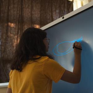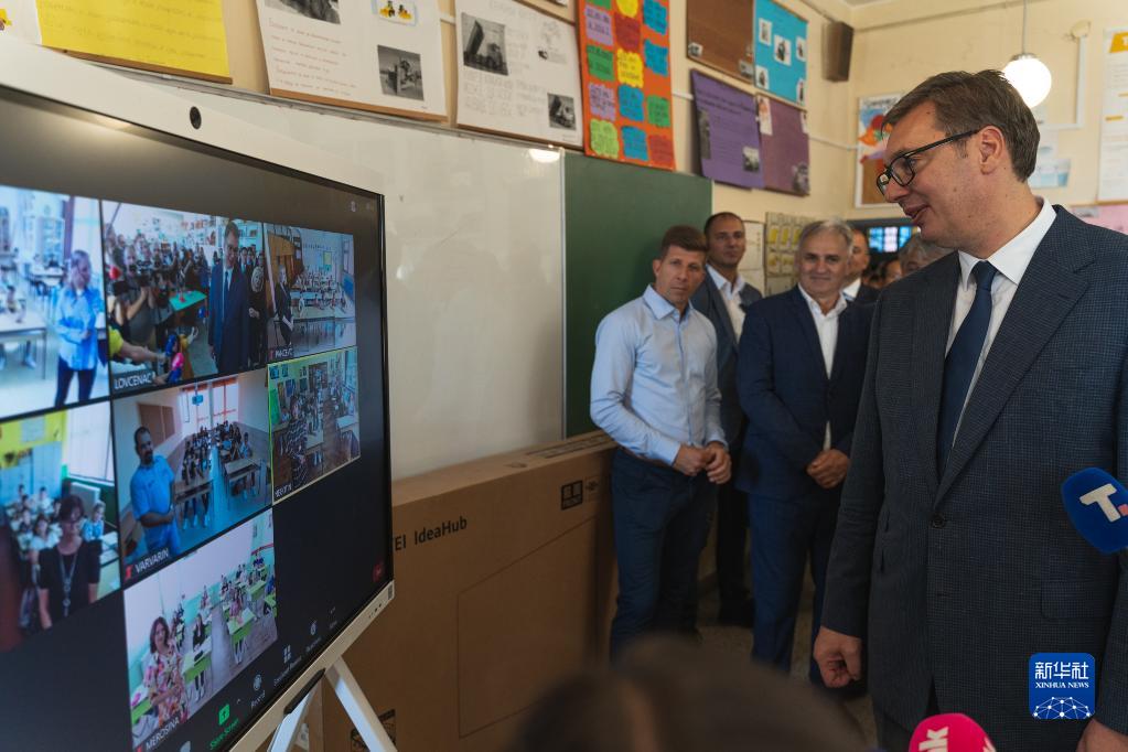 9月1日,在塞爾維亞北部伏伊伏丁那省的一所小學,塞爾維亞總統武契奇(右一)使用華為智慧屏通過視頻連線向塞爾維亞多所小學的學生致以開學問候。