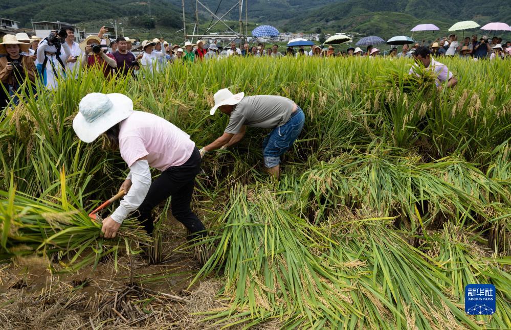 9月2日,在鹽邊縣惠民鎮興隆村的稻田里,來自惠民鎮的村民在參與稻谷收割比賽。