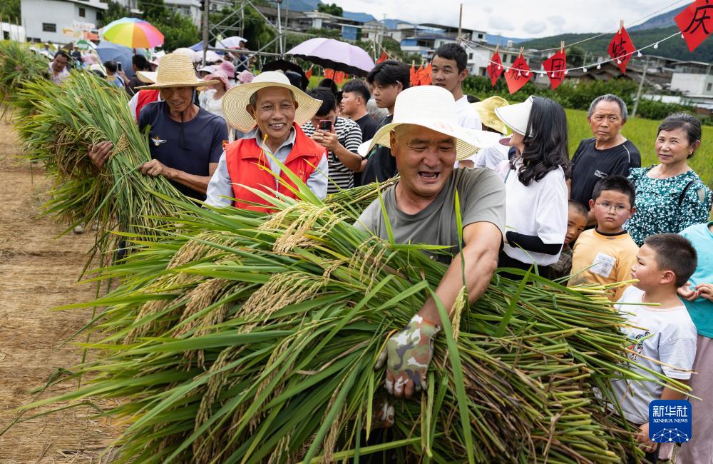 9月2日,在鹽邊縣惠民鎮興隆村的稻田里,村民抱著收割后的水稻分享豐收的喜悅。