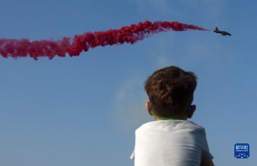 9月2日,一名男孩在希臘塔納格拉空軍基地舉行的雅典飛行周上觀看阿聯酋飛行表演隊的表演。