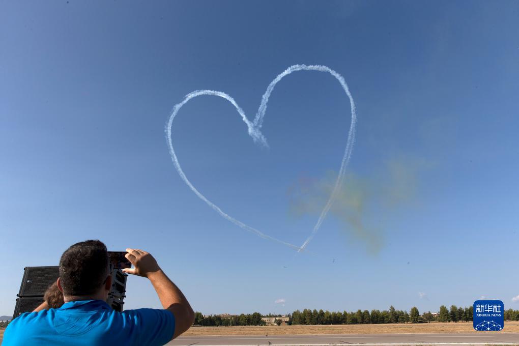 9月2日,一名男子在希臘塔納格拉空軍基地舉行的雅典飛行周上拍攝阿聯酋飛行表演隊的表演。