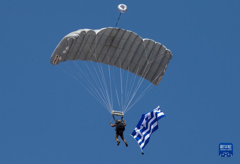 9月2日,在希臘塔納格拉空軍基地的雅典飛行周上,跳傘員在空中展示希臘國(guó)旗。