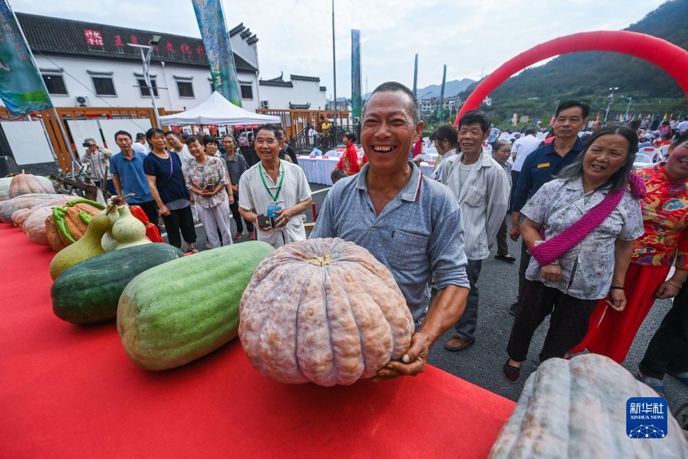 9月3日,王阜村的村民把自家最大的瓜果拿到“報熟節”現場,準備參加果蔬比賽,迎接豐收。