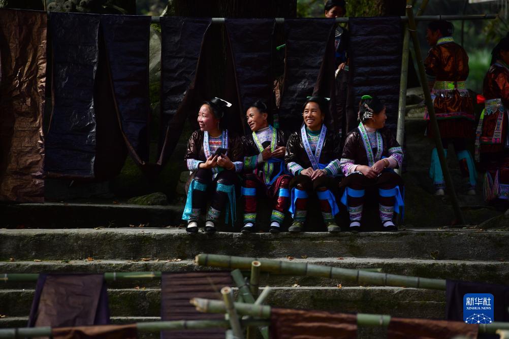 在烏英苗寨,苗族婦女們制作亮布的傳統工藝非常復雜。每年春季,她們都會種植藍靛草,到秋季收割后,用山泉水將藍靛草浸泡數日,然后加入石灰等,調配成染料。布料經過染料浸染、晾曬、捶打、涂蛋清、蒸布,并如此多次反復,一匹亮布做成往往耗時數月之久。其中,最重要的工序就是捶打亮布,每一匹布,苗族婦女都要掄起約十斤重的木槌,捶打數萬下,讓布料逐漸閃閃發亮,制成的“亮布”可以長久保持光澤。