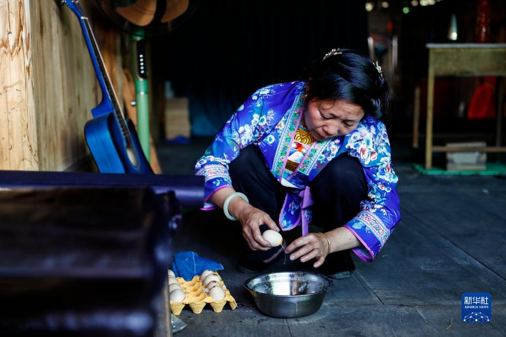 烏英苗寨婦女梁足英在取雞蛋清,準(zhǔn)備給布料涂抹(2023年8月30日攝)。新華社記者 胡星宇 攝