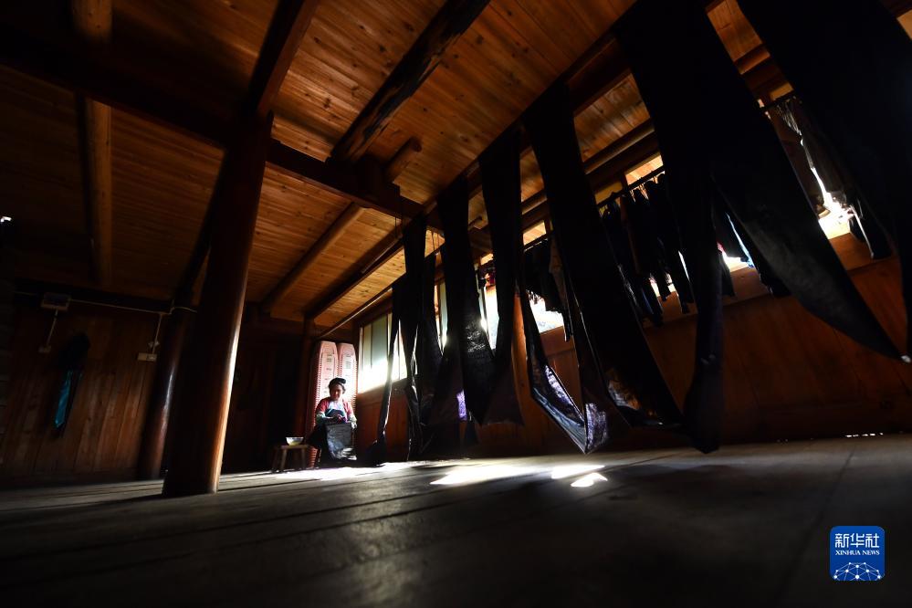 烏英苗寨婦女吳妹秋在給亮布涂蛋清(2023年8月31日攝)。新華社記者 黃孝邦 攝