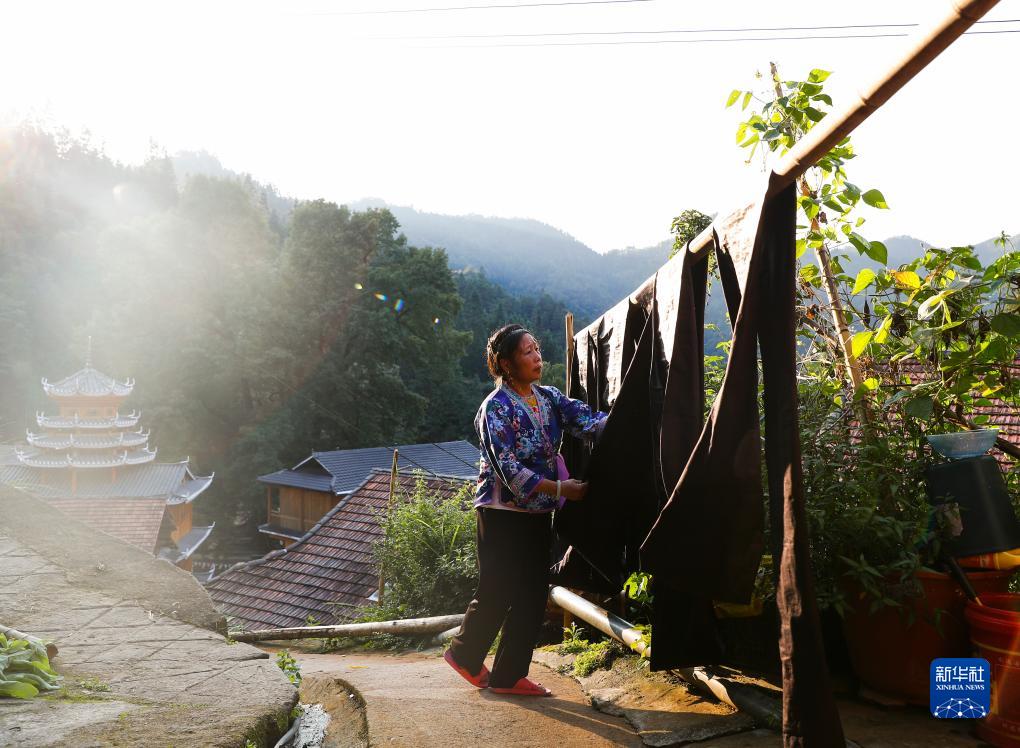 烏英苗寨婦女梁足英在晾曬還未完工的亮布(2023年8月30日攝)。新華社記者 胡星宇 攝