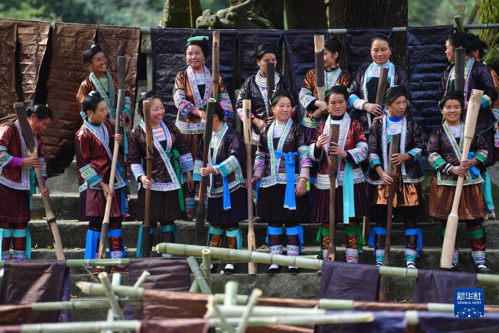 烏英苗寨婦女梁足英(前排左三)和姐妹們在亮布文化節上展示亮布及服飾(2020年10月25日攝)。新華社記者 黃孝邦 攝