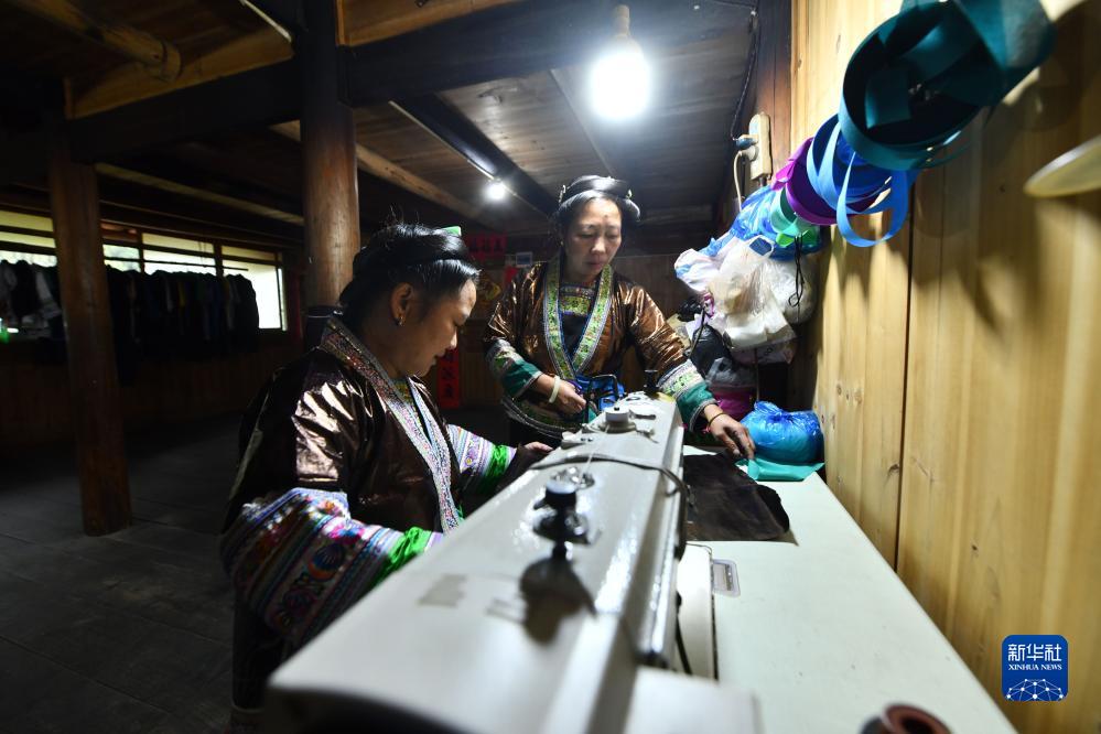 烏英苗寨婦女梁足英(右)、吳妹秋在縫制亮布衣服(2023年8月31日攝)。新華社記者 黃孝邦 攝
