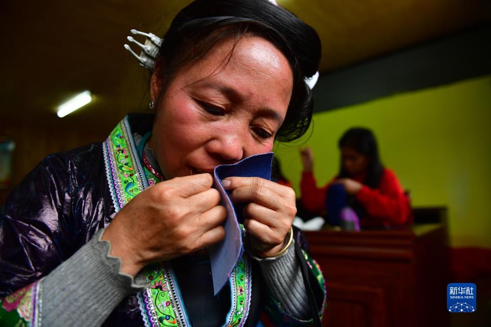 烏英苗寨婦女梁足英在刺繡(2019年10月19日攝)。新華社記者 黃孝邦 攝