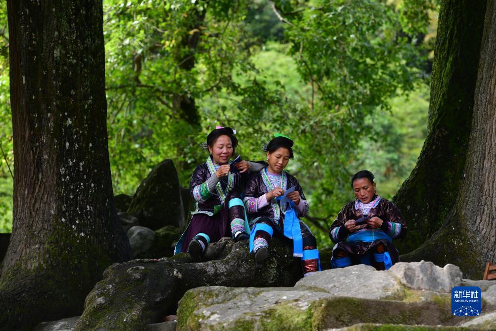 烏英苗寨婦女梁足英(左一)在刺繡(2019年10月18日攝)。新華社記者 黃孝邦 攝
