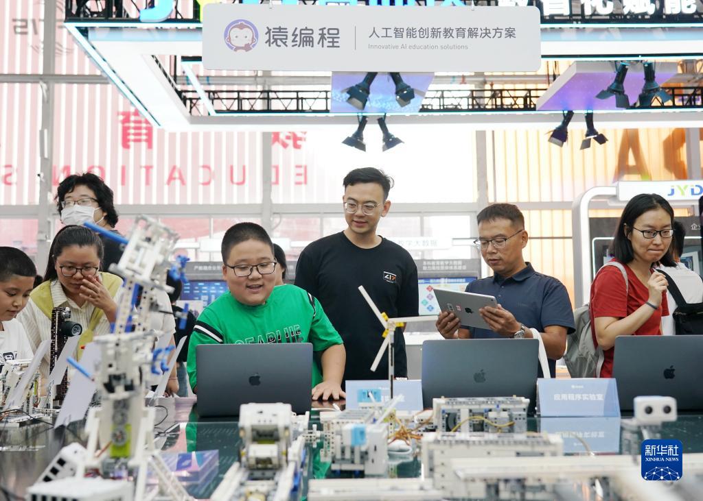 9月3日,在首鋼園教育服務(wù)專(zhuān)題展區(qū),小朋友在體驗(yàn)智能硬件編程作品。