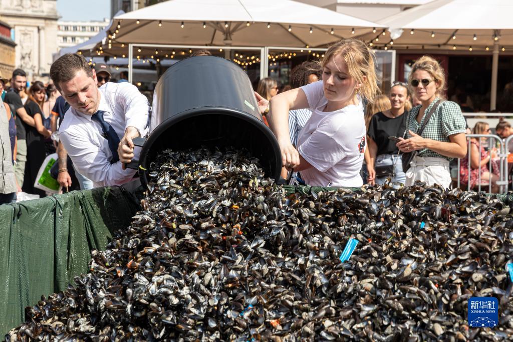 9月3日,在法國里爾舊貨市場上,工作人員傾倒顧客就餐后留下的貽貝殼。
