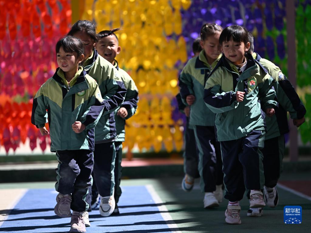 9月4日,青海省果洛藏族自治州瑪沁縣大武幼兒園小朋友在體育課上跑步。