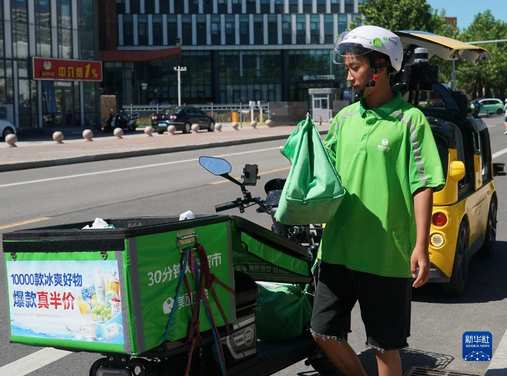 在位于北京市順義區的一處自動配送車指定??奎c,一名騎手取走自動配送車中的訂單準備送至顧客手中(8月22日攝)。