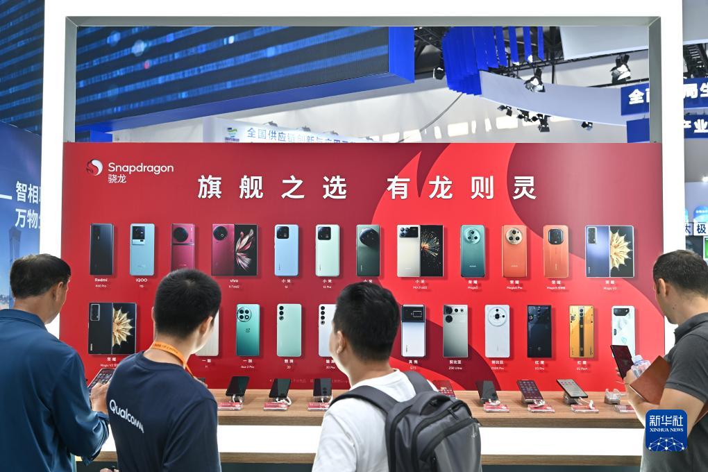 9月4日,參觀者在國家會議中心的高通展臺了解搭載了高通驍龍芯片的手機。