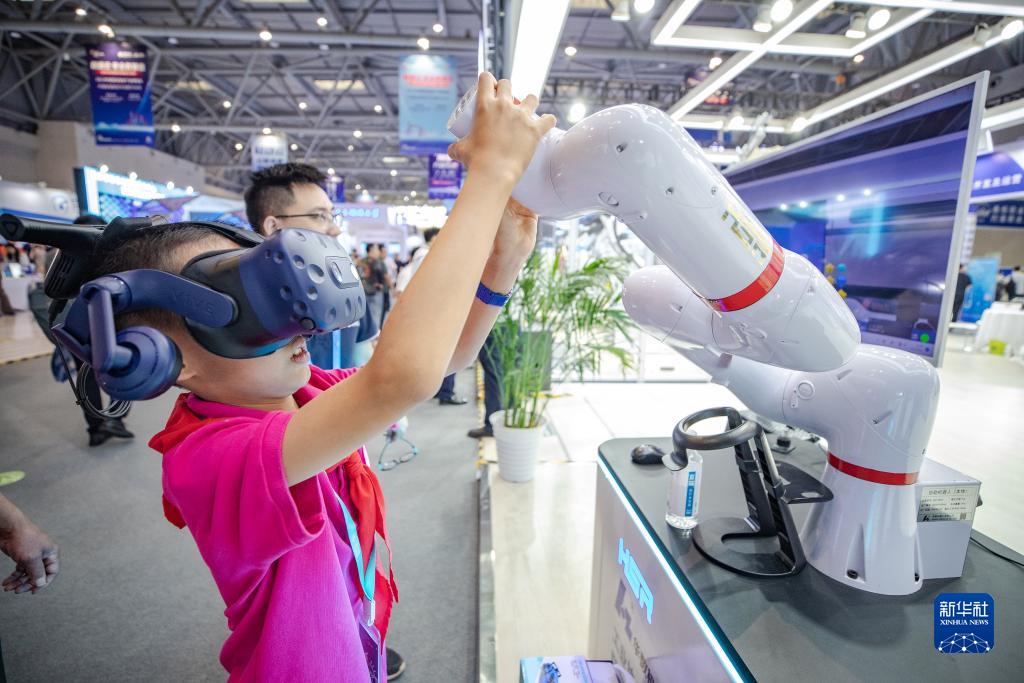 9月4日,在2023智博會華數機器人展廳,觀眾體驗工業(yè)協作機器人。