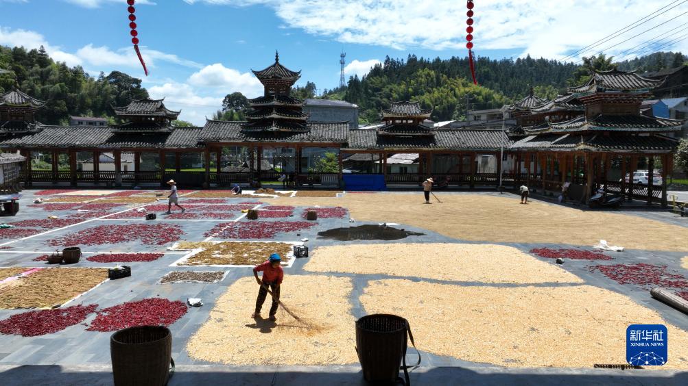 9月4日,村民在貴州省黔東南苗族侗族自治州錦屏縣大同鄉秀洞村廣場晾曬農作物(無人機照片)。