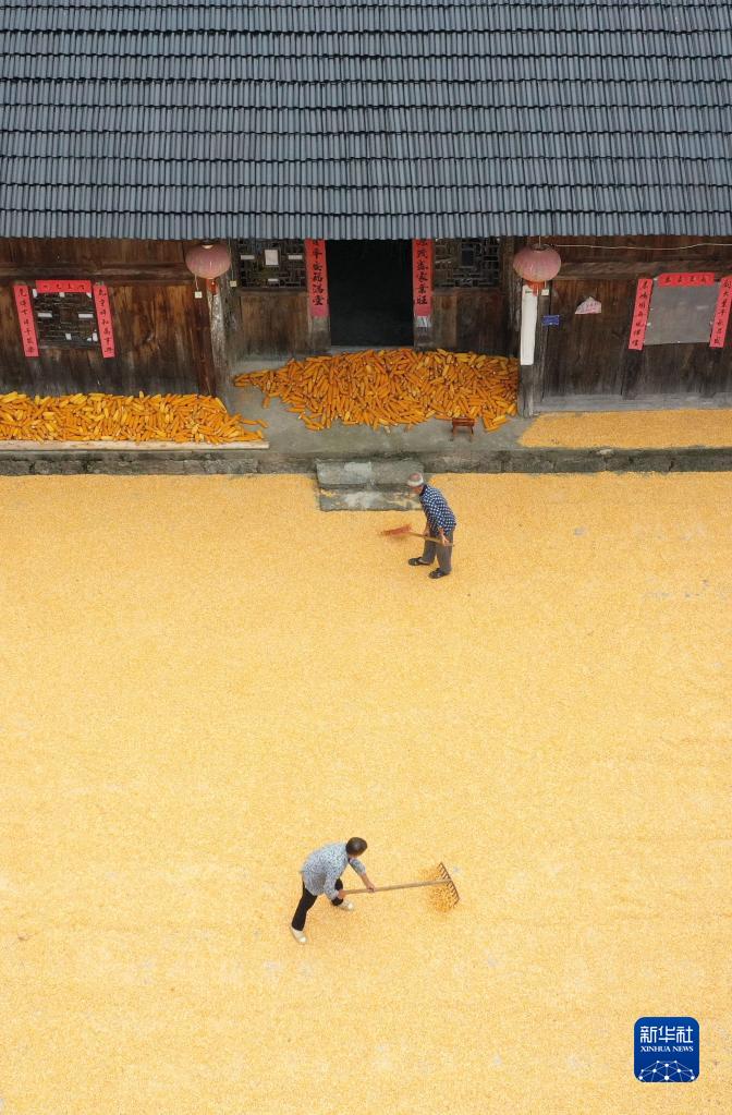 9月3日,村民在貴州省福泉市陸坪鎮福興村院壩晾曬玉米(無人機照片)。