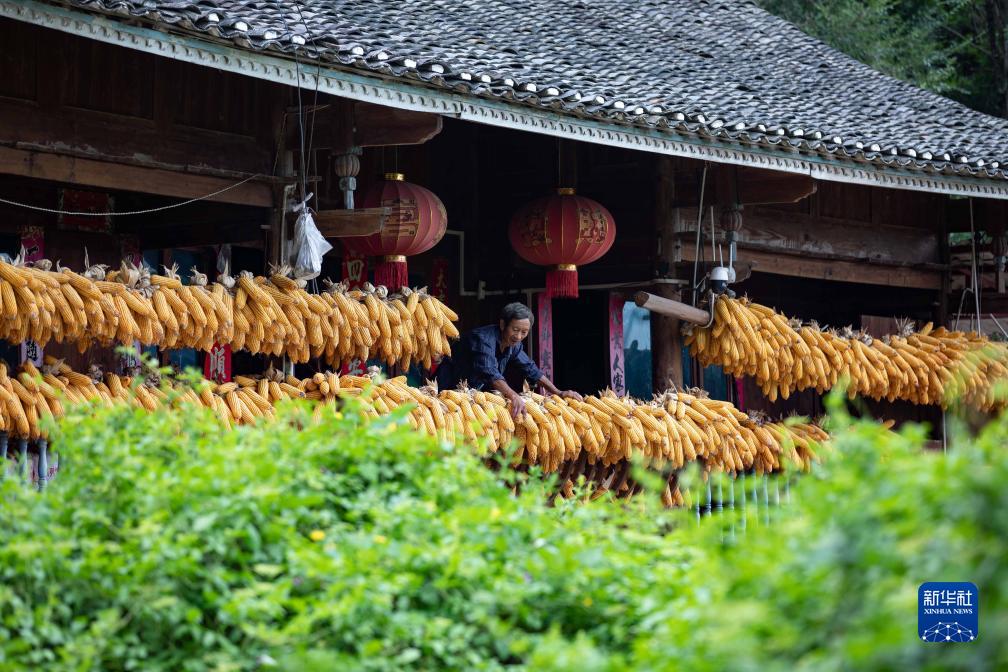 9月4日,貴州省黔東南苗族侗族自治州丹寨縣龍泉鎮羊甲村村民在晾曬玉米。