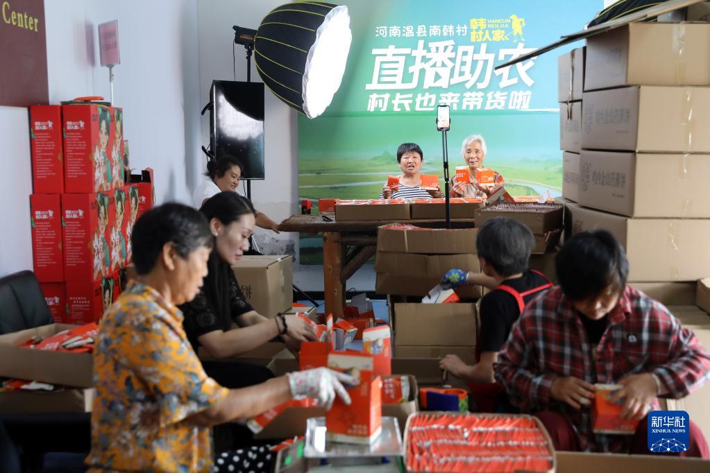 9月4日,在焦作市溫縣黃莊鎮(zhèn)南韓村,村民在直播間包裝當?shù)靥禺a。