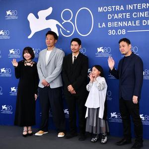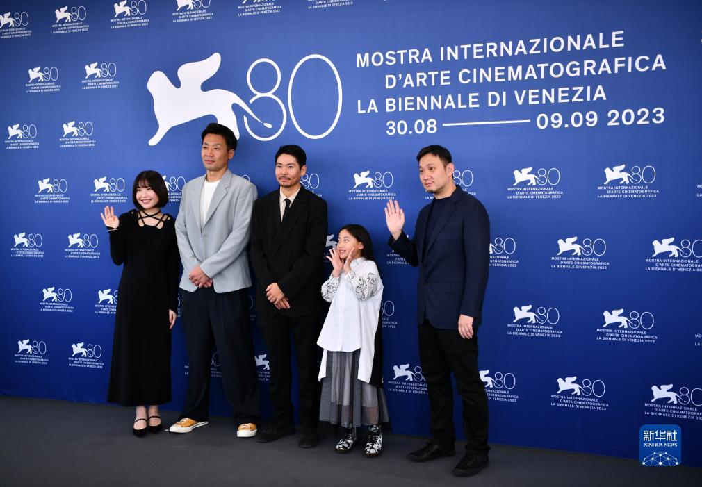 9月4日,電影《邪惡不存在》導(dǎo)演濱口龍介(右一)攜主創(chuàng)人員出席意大利威尼斯電影節(jié)拍照式。