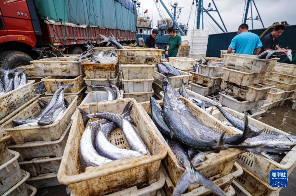 當(dāng)日,山東省榮成市成山鎮(zhèn)落鳳漁港一派繁忙景象,秋捕歸來(lái)的漁船滿載而歸,靠港卸魚。