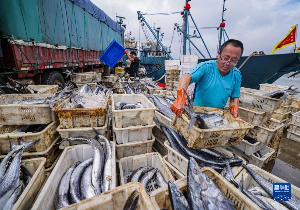 9月4日,漁民在榮成市成山鎮落鳳漁港分揀、裝運漁獲。