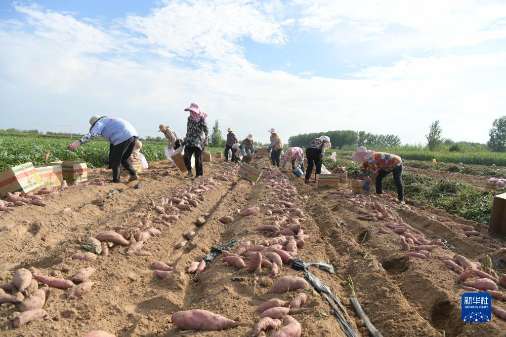 9月4日,山東省臨沂市臨沭縣蛟龍鎮農民忙著撿拾地瓜、分揀裝箱。