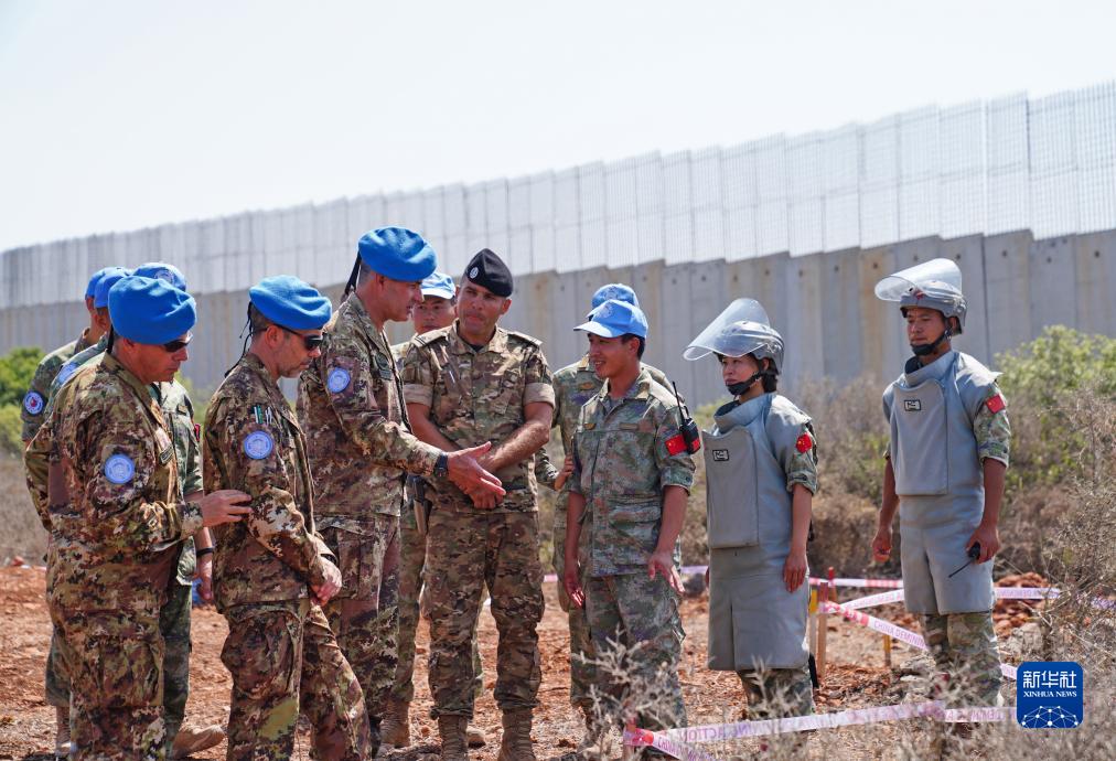 9月4日,在黎巴嫩南部“藍線”附近雷場,聯合國駐黎巴嫩臨時部隊(聯黎部隊)西區司令喬瓦尼·布拉法準將(左三)與中國第21批赴黎維和部隊掃雷官兵交流。