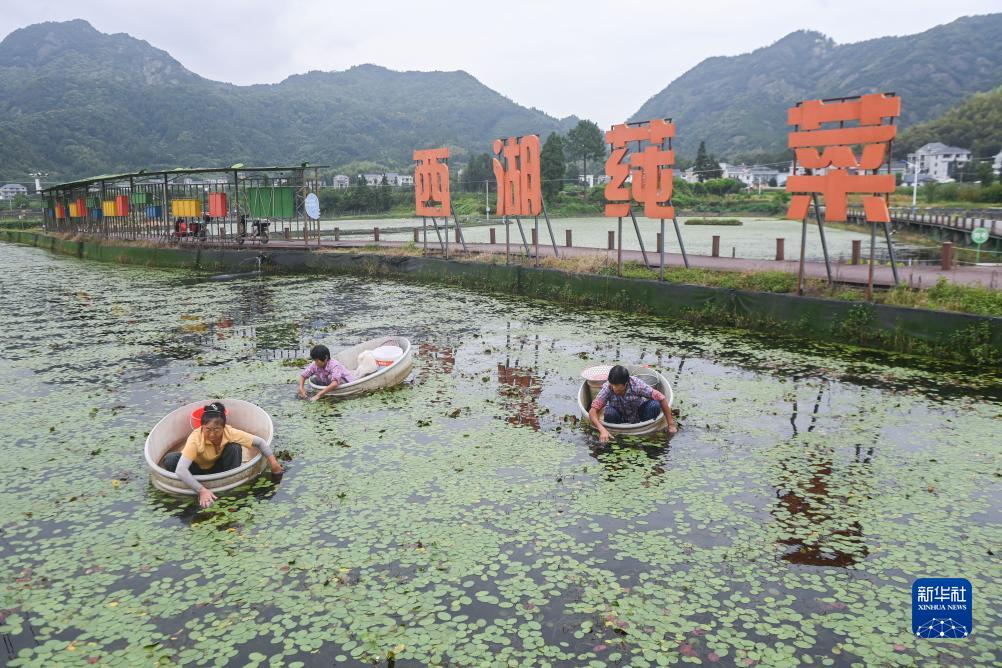 9月5日,在建德市航頭鎮烏龍村莼菜基地,村民劃著“盆船”在西湖莼菜產業園種植基地的水面上采摘西湖莼菜。