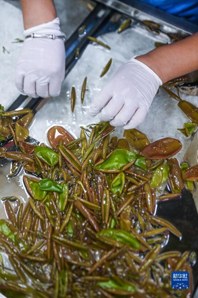 9月5日,在建德市航頭鎮烏龍村西湖莼菜產業園的車間內,工人在分揀剛剛采摘的莼菜。