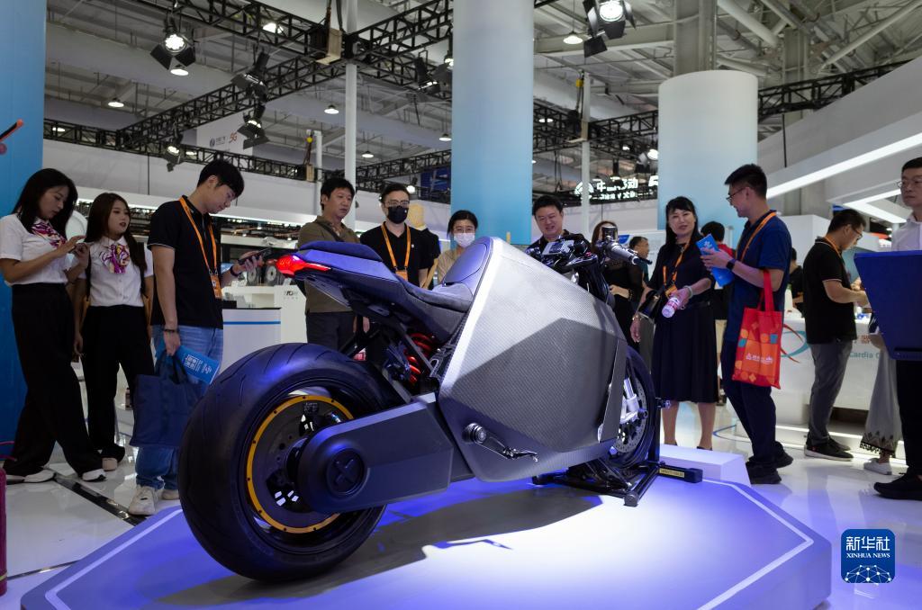 9月5日,觀眾在服貿(mào)會首鋼園區(qū)的中關(guān)村科技園房山園展臺參觀一款電動摩托車。